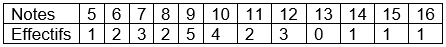 On voit que 1 élève a eu 5, deux ont eu 6, …. On peut réécrire cette série sous forme de tableau :