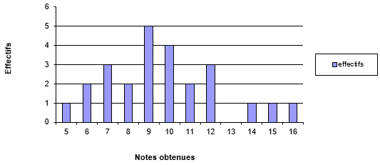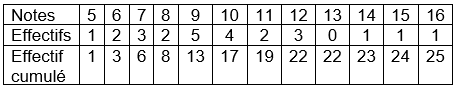 Ce tableau nous donne le nombre d’élèves qui ont eu une note inférieure à une note donnée. Par exemple, 6 élèves ont eu une note inférieure ou égale à 7, 13 n’ont pas eu la moyenne…