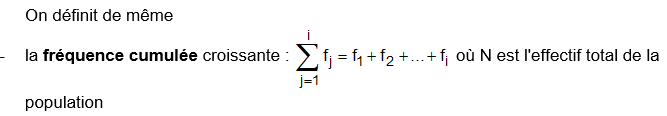Si ni est l’effectif de la valeur xi, on appelle effectif cumulé croissant jusqu’à la ie valeur le nombre : c’est le nombre des individus présentant une modalité inférieure à xi .
