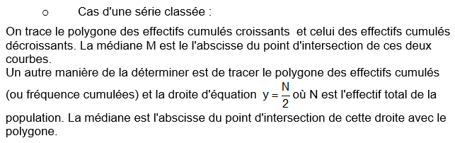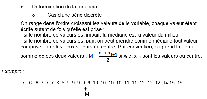 C’est la valeur de la variable qui partage la population en deux parties de même effectif : c’est donc la valeur M de xi telle que la moitié au plus des valeurs des xi soient inférieures à M et la moitié au plus des valeurs de xi supérieure à M.