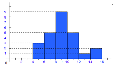 On porte en abscisses les valeurs de la variable x et en ordonnées les effectifs. L’effectif est représenté par un rectangle dont la base est égale à l’étendue de la classe et la hauteur proportionnelle à l’effectif.