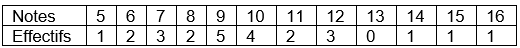 On voit que 1 élève a eu 5, deux ont eu 6, …. On peut réécrire cette série sous forme de tableau :