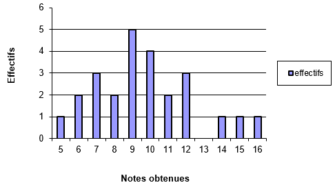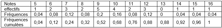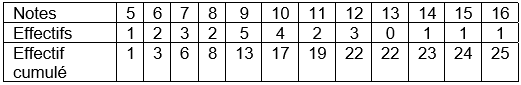 Ce tableau nous donne le nombre d’élèves qui ont eu une note inférieure à une note donnée. Par exemple, 6 élèves ont eu une note inférieure ou égale à 7, 13 n’ont pas eu la moyenne…