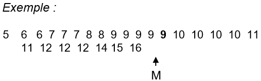 C’est la valeur de la variable qui partage la population en deux parties de même effectif : c’est donc la valeur M de xi telle que la moitié au plus des valeurs des xi soient inférieures à M et la moitié au plus des valeurs de xi supérieure à M