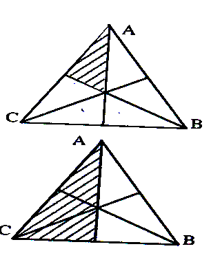 2°) ABC est un triangle isocèle de sommet A, avec ses trois médianes tracées.