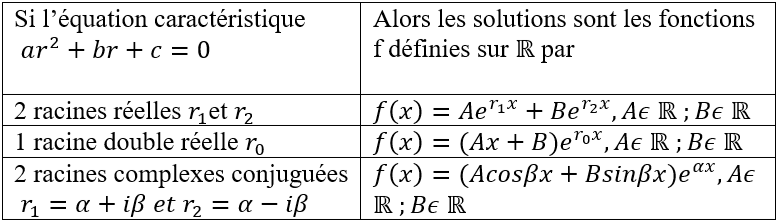 On appelle équation caractéristique de l’équation différentielle ay’’ + by’ +cy= 0 (a et b réels)