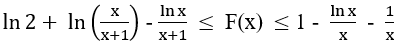 b) On pose A=\lim\limits_{\substack{x\rightarrow +\infty}}F(x).~Déduire de la question 3.c) que \ln 2 \leq A \leq 1 .